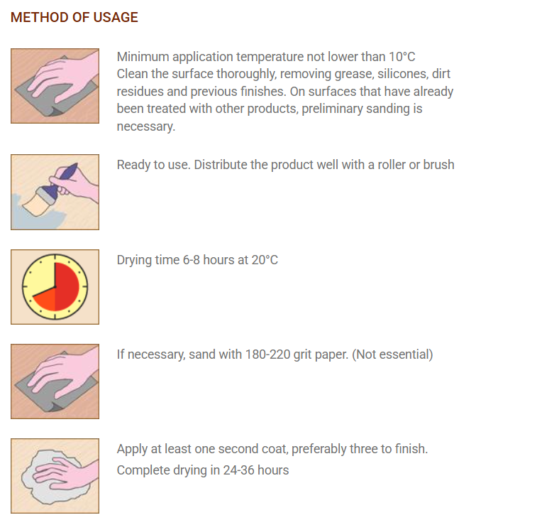 It penetrates deeply into the wood, nourishing the surface with a highly elastic protective and decorative layer.