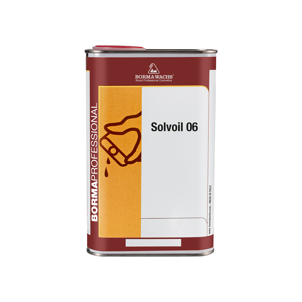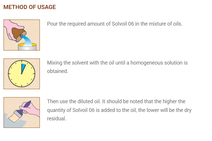 Solvoil 06 Special thinner for the balanced dilution of Borma Wachs oils. Thanks to its special drying gradual speed, Solvoil 06 allows to increase the time of hardening of the diluted oil. It can be easily added at any ratio.